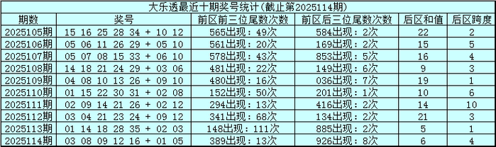 体彩大乐透第25114期奖号开出:03 08 09 12 16+01 05,前区奖号大小比为0:5,012路比为3:1:1,奇偶比为2:3,后区号码和值为6,跨度为4。